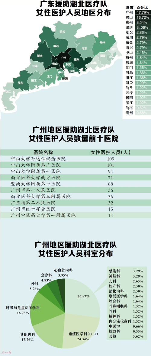 平安是对社会最大的贡献 文、表/广州日报全媒体记者徐静 疫情就是命令,防控就是责任。新冠肺炎疫情发生以来,全国上下齐心协力、众志成城,防控工作迅速开展,一场新冠肺炎疫情防控的人民战争、总体战、阻击战在全国展开。 今天是“三八”国际妇女节,广州日报数据和数字化研究院(GDI智库)联合广州市妇联发布大数据报告《疫情防控中的女性力量》,展示各行业女性在疫情防控中的工作状态和重要社会贡献,反映女性在抗击疫情中的重要甚至支撑作用。报告认为,女性是社区、家庭疫情防控的“生力军”,以医护人员为代表的女性成为抗击疫情最坚强力量。 全国:多省援助湖北医护人员中女性超半数 截至3月1日,共有316批次医疗队支援湖北,医护人员达39108余人。其中江苏13批次2804人、广东24批次2461人、辽宁11批次2030人,3省援助湖北医疗队医护人员人数排名全国前三。 在疫情防控的各层面、各领域、各阶段,女性发挥着不可替代的重要作用。在抗疫一线,女性顶起“半边天”。截至2月9日,全国支援武汉的19800名医护人员中,约有护士14000人,护士中近9成是女性。此后1个月,随着全国各地不断派出援助湖北医疗队,女性医护人员的数量也在不断增加。 截至2月12日,上海市出征武汉的医生中过半数为女性,护士中女性超过90%;截至2月11日,山东省援鄂医疗队的1385人中,女性近六成;截至2月15日,湖南省累计向湖北省派驻的1074位医疗队队员中,七成是女性。 3月5日,国家卫健委追授34人为“全国卫生健康系统新冠肺炎疫情防控工作先进个人”称号,其中女性8名。 广东:援助湖北医护人员中女性占比近6成 广东省卫健委数据显示,截至2月23日,广东累计向湖北派出24批共2461名医疗队员,其中女性1471人,占比近60%。 广东援助湖北医疗队女性医护人员47.79%来自广州,接近1/2,反映出广州在广东医疗卫生领域优势极大。排名第二的佛山占比16.72%,其余19个城市合计占比35.49%。 广东地区各大医院支援女性医护人员数量中,排名前三的分别是中山大学孙逸仙纪念医院、中山大学附属第三医院、中山大学附属第一医院,支援人数分别为109人、101人、94人。 在女性医护人员中,平均年龄约32岁;最年长者59岁,最年轻者20岁。30-39岁年龄段人数最多,占比46.42%;其次是20-29岁年龄段,占比38.74%;40-49岁年龄段占比11.49%,50岁以上占比3.35%。 对女性医护人员中的760位进行所在科室分析,28%来自呼吸与危重症医学科,23%来自重症医学科(ICU),6%来自感染科,5%来自急诊科,5%来自外科,其余33%分别来自神经科、心血管内科、妇产科、儿科、骨科、消化内科等其他科室。 女性医护人员中,护理人员人数最多,占比89.98%,其中护师占比48.17%、主管护师占比27.78%、护士占比19.97%、副主任护师占比3.06%、主任护师占比1.02%;女性医生占比8.1%,其中主治医师占比48.11%、副主任医师占比29.25%、主任医师占比12.26%、医师占比10.38%。 广州:援助湖北医护人员中女性占55.97% 截至2月23日,广州地区医疗机构已派出1256名医护人员援助湖北,其中女性703人,占比55.97%。 广州地区各大医院援助湖北女性医护人员数量,排名前三的分别是中山大学孙逸仙纪念医院、中山大学附属第三医院和中山大学附属第一医院,驰援人数分别为109人、101人、94人。 (责任编辑:Doctor001) |