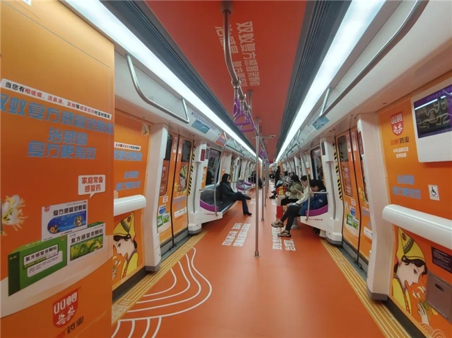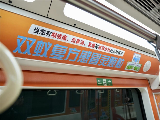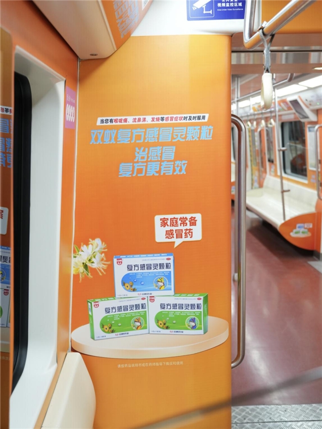 本次地铁主题专列在车厢内,门贴、车身、顶图、地贴等处,集中展示了双蚁复方感冒灵颗粒的产品信息,通过地铁的广泛影响力,快速、清晰地传达给了消费者,打造更具影响力的品牌产品形象。