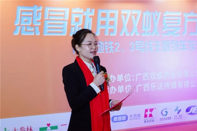 【南宁地铁2.3号线】 大参林广西营运大区副总经理梁梅致辞中表示:“大参林医药集团和双蚁药业,两家企业发挥各自优势携手合作,这是一次重要的进步。双蚁复方感冒灵颗粒走进地铁,走进千家万户,为广大家庭提供健康服务,并祝愿双蚁药业在新的一年取得新突破。”