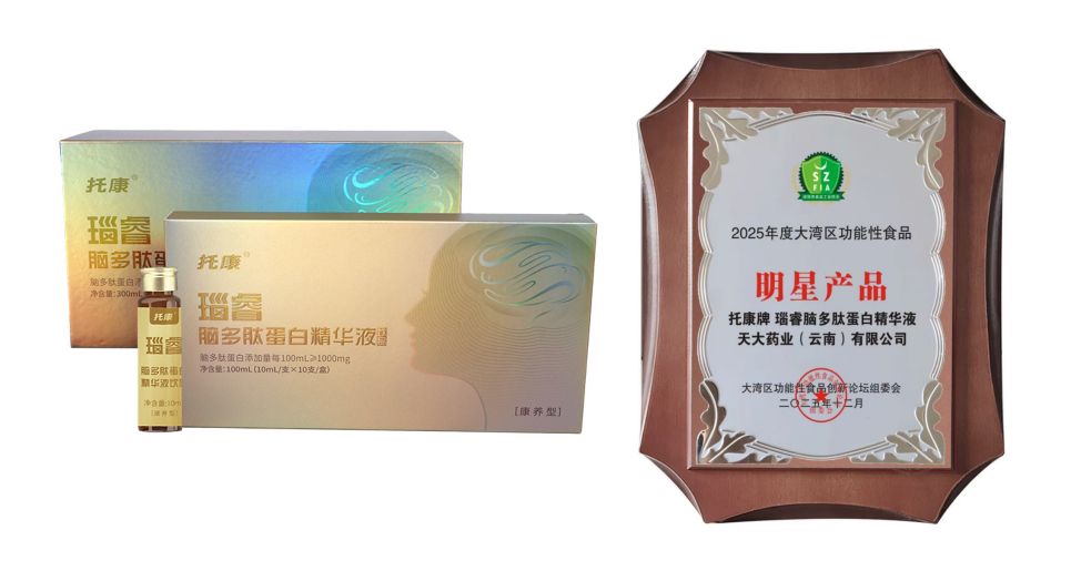 托康瑙睿脑多肽蛋白精华液在2025大湾区功能性食品创新论坛暨颁奖典礼上,凭借其精湛工艺、精选原料与显著功效,从众多参评产品中脱颖而出。 两款产品分别针对免疫增强和脑健康两大核心需求,体现了托康品牌多元化产品布局的战略思路。这为企业开拓市场注入强大动力,也巩固了天大药业在中医药与健康产品领域的领先地位。天大药业始终坚守“您的健康是天大的事”这一核心使命,将消费者健康置于首位。此次托康品牌两款产品同时获得国家权威认证与行业创新奖项,正是企业践行这一使命、承担健康责任的切实体现。 未来,天大药业将继续以科研创新为驱动,以安全高效为标准,持续推出更多优质健康产品,不辜负每一位消费者的信任,为提升全民健康水平贡献专业力量。 有关天大药业有限公司 天大药业有限公司(香港联交所上市公司,股份代号:00455.HK)以发展中医药产业为基础,发展创新药物和医疗科技,发展优质医疗和保健服务,致力发展成为立足中国,辐射全球的领先医药企业。