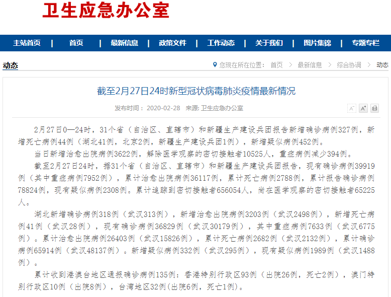2月27日0—24时,31个省(自治区、直辖市)和新疆生产建设兵团报告新增确诊病例327例,新增死亡病例44例(湖北41例,北京2例,新疆生产建设兵团1例),新增疑似病例452例。 当日新增治愈出院病例3622例,解除医学观察的密切接触者10525人,重症病例减少394例。 ![]() 截至2月27日24时,据31个省(自治区、直辖市)和新疆生产建设兵团报告,现有确诊病例39919例(其中重症病例7952例),累计治愈出院病例36117例,累计死亡病例2788例,累计报告确诊病例78824例,现有疑似病例2308例。累计追踪到密切接触者656054人,尚在医学观察的密切接触者65225人。 湖北新增确诊病例318例(武汉313例),新增治愈出院病例3203例(武汉2498例),新增死亡病例41例(武汉28例),现有确诊病例36829例(武汉30179例),其中重症病例7633例(武汉6775例)。累计治愈出院病例26403例(武汉15826例),累计死亡病例2682例(武汉2132例),累计确诊病例65914例(武汉48137例)。新增疑似病例332例(武汉295例),现有疑似病例1989例(武汉1488例)。 累计收到港澳台地区通报确诊病例135例:香港特别行政区93例(出院26例,死亡2例),澳门特别行政区10例(出院8例),台湾地区32例(出院6例,死亡1例)。 (责任编辑:Doctor001) |