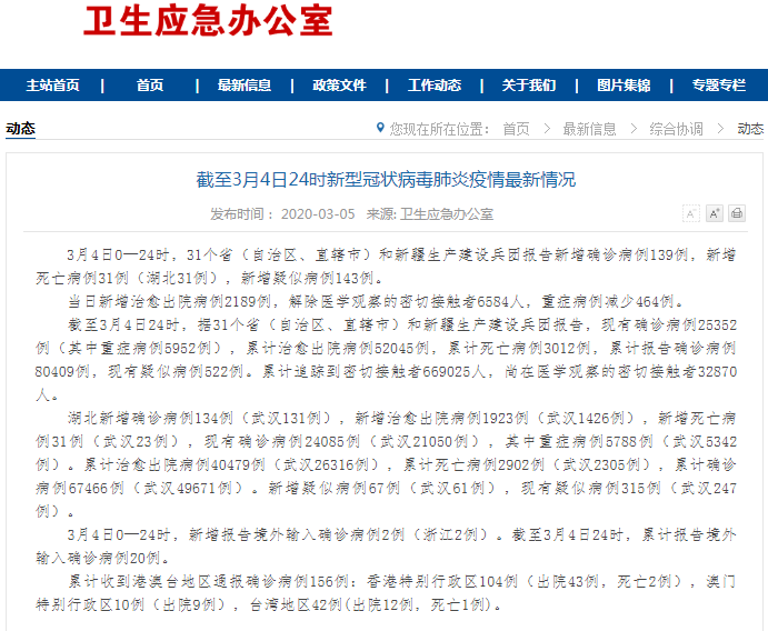 3月4日0—24时,31个省(自治区、直辖市)和新疆生产建设兵团报告新增确诊病例139例,新增死亡病例31例(湖北31例),新增疑似病例143例。 当日新增治愈出院病例2189例,解除医学观察的密切接触者6584人,重症病例减少464例。 ![]() 截至3月4日24时,据31个省(自治区、直辖市)和新疆生产建设兵团报告,现有确诊病例25352例(其中重症病例5952例),累计治愈出院病例52045例,累计死亡病例3012例,累计报告确诊病例80409例,现有疑似病例522例。累计追踪到密切接触者669025人,尚在医学观察的密切接触者32870人。 湖北新增确诊病例134例(武汉131例),新增治愈出院病例1923例(武汉1426例),新增死亡病例31例(武汉23例),现有确诊病例24085例(武汉21050例),其中重症病例5788例(武汉5342例)。累计治愈出院病例40479例(武汉26316例),累计死亡病例2902例(武汉2305例),累计确诊病例67466例(武汉49671例)。新增疑似病例67例(武汉61例),现有疑似病例315例(武汉247例)。 3月4日0—24时,新增报告境外输入确诊病例2例(浙江2例)。截至3月4日24时,累计报告境外输入确诊病例20例。 累计收到港澳台地区通报确诊病例156例:香港特别行政区104例(出院43例,死亡2例),澳门特别行政区10例(出院9例),台湾地区42例(出院12例,死亡1例)。 (责任编辑:Doctor001) |
