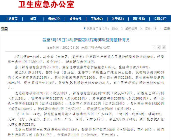 3月19日0—24时,31个省(自治区、直辖市)和新疆生产建设兵团报告新增确诊病例39例,新增死亡病例3例(湖北2例,辽宁1例),新增疑似病例31例。 当日新增治愈出院病例730例,解除医学观察的密切接触者1197人,重症病例减少178例。 ![]() 截至3月19日24时,据31个省(自治区、直辖市)和新疆生产建设兵团报告,现有确诊病例6569例(其中重症病例2136例),累计治愈出院病例71150例,累计死亡病例3248例,累计报告确诊病例80967例,现有疑似病例104例。累计追踪到密切接触者684331人,尚在医学观察的密切接触者8989人。 湖北新增确诊病例0例(武汉0例),新增治愈出院病例703例(武汉624例),新增死亡病例2例(武汉2例),现有确诊病例6287例(武汉6118例),其中重症病例2098例(武汉2062例)。累计治愈出院病例58381例(武汉41389例),累计死亡病例3132例(武汉2498例),累计确诊病例67800例(武汉50005例)。新增疑似病例0例(武汉0例),现有疑似病例0例(武汉0例)。 3月19日0—24时,新增报告境外输入确诊病例39例(广东14例,上海8例,北京6例,福建3例,天津、辽宁、黑龙江、浙江、山东、广西、四川、甘肃各1例)。截至3月19日24时,累计报告境外输入确诊病例228例。 累计收到港澳台地区通报确诊病例333例:香港特别行政区208例(出院98例,死亡4例),澳门特别行政区17例(出院10例),台湾地区108例(出院26例,死亡1例)。 (责任编辑:Doctor001) |