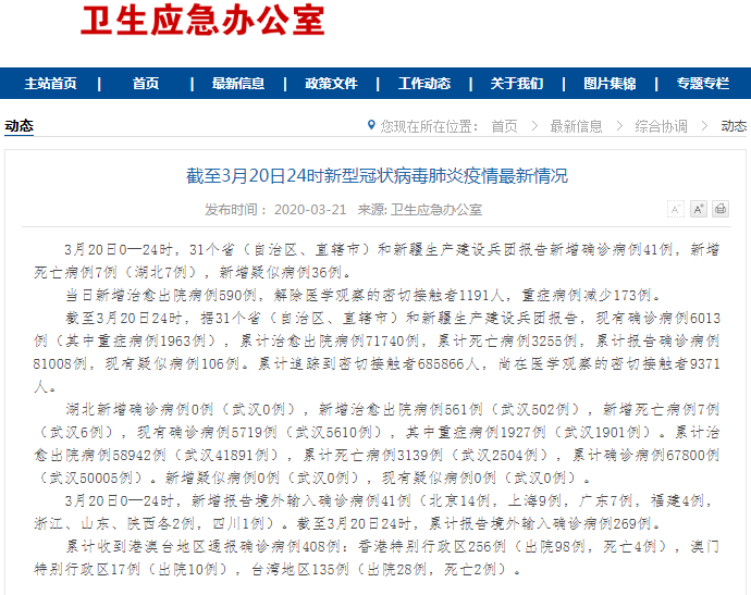 3月20日0—24时,31个省(自治区、直辖市)和新疆生产建设兵团报告新增确诊病例41例,新增死亡病例7例(湖北7例),新增疑似病例36例。 当日新增治愈出院病例590例,解除医学观察的密切接触者1191人,重症病例减少173例。 ![]() 截至3月20日24时,据31个省(自治区、直辖市)和新疆生产建设兵团报告,现有确诊病例6013例(其中重症病例1963例),累计治愈出院病例71740例,累计死亡病例3255例,累计报告确诊病例81008例,现有疑似病例106例。累计追踪到密切接触者685866人,尚在医学观察的密切接触者9371人。 湖北新增确诊病例0例(武汉0例),新增治愈出院病例561例(武汉502例),新增死亡病例7例(武汉6例),现有确诊病例5719例(武汉5610例),其中重症病例1927例(武汉1901例)。累计治愈出院病例58942例(武汉41891例),累计死亡病例3139例(武汉2504例),累计确诊病例67800例(武汉50005例)。新增疑似病例0例(武汉0例),现有疑似病例0例(武汉0例)。 3月20日0—24时,新增报告境外输入确诊病例41例(北京14例,上海9例,广东7例,福建4例,浙江、山东、陕西各2例,四川1例)。截至3月20日24时,累计报告境外输入确诊病例269例。 累计收到港澳台地区通报确诊病例408例:香港特别行政区256例(出院98例,死亡4例),澳门特别行政区17例(出院10例),台湾地区135例(出院28例,死亡2例)。 (责任编辑:Doctor001) |