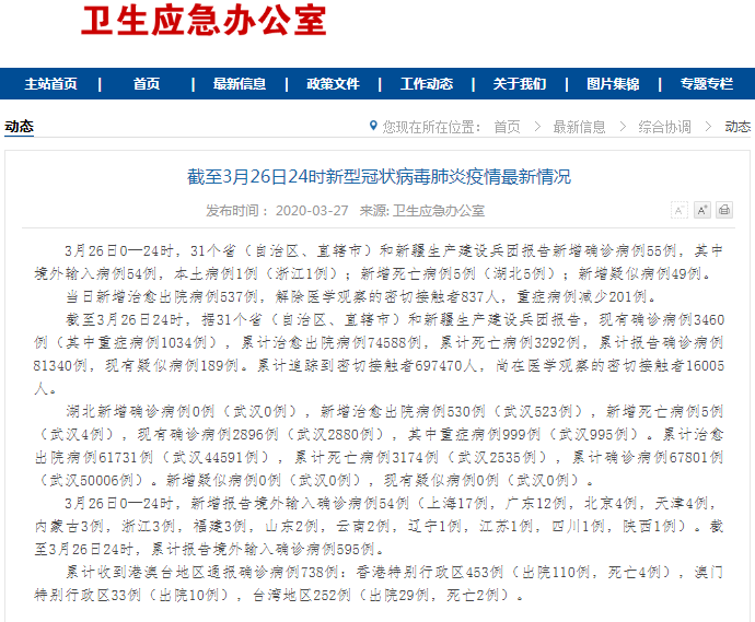 3月26日0—24时,31个省(自治区、直辖市)和新疆生产建设兵团报告新增确诊病例55例,其中境外输入病例54例,本土病例1例(浙江1例);新增死亡病例5例(湖北5例);新增疑似病例49例。 当日新增治愈出院病例537例,解除医学观察的密切接触者837人,重症病例减少201例。 ![]() 截至3月26日24时,据31个省(自治区、直辖市)和新疆生产建设兵团报告,现有确诊病例3460例(其中重症病例1034例),累计治愈出院病例74588例,累计死亡病例3292例,累计报告确诊病例81340例,现有疑似病例189例。累计追踪到密切接触者697470人,尚在医学观察的密切接触者16005人。 湖北新增确诊病例0例(武汉0例),新增治愈出院病例530例(武汉523例),新增死亡病例5例(武汉4例),现有确诊病例2896例(武汉2880例),其中重症病例999例(武汉995例)。累计治愈出院病例61731例(武汉44591例),累计死亡病例3174例(武汉2535例),累计确诊病例67801例(武汉50006例)。新增疑似病例0例(武汉0例),现有疑似病例0例(武汉0例)。 3月26日0—24时,新增报告境外输入确诊病例54例(上海17例,广东12例,北京4例,天津4例,内蒙古3例,浙江3例,福建3例,山东2例,云南2例,辽宁1例,江苏1例,四川1例,陕西1例)。截至3月26日24时,累计报告境外输入确诊病例595例。 累计收到港澳台地区通报确诊病例738例:香港特别行政区453例(出院110例,死亡4例),澳门特别行政区33例(出院10例),台湾地区252例(出院29例,死亡2例)。 (责任编辑:Doctor001) |