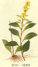 【理化鉴别】 (1)取本品粉末1g,加水适量煮沸,制成1%水浸液,经剧烈振摇后,有持久性泡沫。(检查皂甙)(2)取本品粉末5g,加甲醇25ml回流20min,滤过。滤液1ml,加盐酸数滴及镁粉少许,渐显红色反应。(检查黄酮)(3)薄层色谱 将上述甲醇提取液浓缩成1:1作为供试品溶液。另以芦丁的甲醇深液作为对照品溶液。取供试品溶液和对照品溶液分别点样于同一聚酰胺薄膜(浙江黄岩)上。用丙酮-甲醇-水(2:1:1)展开,展距10cm。先在紫外光灯(254nm)下观察,供试品溶液色谱在与对照品溶液色谱的相应位置上显相同的红棕色荧光斑点;再喷以1%三氯化铝剂后烤干,斑点转亮黄色。 【药理作用】 1.抗菌作用 煎剂(品种未鉴定)在试管内对金黄色葡萄球菌、肺炎球菌、绿脓杆菌及舒氏、宋内氏痢疾杆菌有不同程度的抑菌作用。 2.对家兔实验性气管炎(吸入氨水蒸气形成)的作用 煎剂内服,有治疗作用,喘息状态解除,哮鸣音消失,干性罗音减轻。因含皂甙,尚有些祛痰作用。 3. 利尿作用 提取物对小鼠皮下注射有利尿作用,但剂量太大反可使尿量减少。口服同样有效。对人亦有此作用。久贮失效。 4.其他作用 对急性(出血性)肾炎有止血作用,可能与其所含之黄酮类或绿原酸、咖啡酸有关。外用可治创伤,可能与其含挥发油或鞣质有关。 【采收加工】 播和中当年开花,9-10月开花盛期,割取地上部分,或挖取根部,洗净,鲜用或晒干。 【炮制】 取全草或带根全草,洗净、晒干、切断、备用。亦可鲜用。 【附方】 1.治感冒,咽喉肿痛,扁桃体炎:一枝黄花三钱至一两。煎服。(《上海常用中草药》)2.治头风;一枝黄花根三钱。水煎服。(《湖南药物志》)3.治黄疸:一枝黄花一两五钱,水丁香五钱)水煎,一次服。(《闽东本草》)4.治小儿急惊风:鲜一枝黄花一两,生姜一片。同捣烂取汁,开水冲服。(《闽东本草》)5.治跌打损伤:一枝黄花根三至五钱。水煎,二次分服。6.治发背、乳痈、腹股沟淋巴腺肿:一枝黄花七钱至一两。捣烂,酒煎服,渣捣烂敷患处。7.治痈肿溃后腐肉不脱:一枝黄花二两,野菊根一两。醋煎熏疮口。8.治一切肿毒初起:一枝黄花二两。煎水淋洗,或用毛巾浸药汁温敷患处。9.治咽喉肿毒:一枝黄花七钱。水煎,加蜂蜜一两调敷。10.治毒蛇咬伤:一枝黄花一两。水煎,加蜂蜜一两调服。外用全草同酒糟杵烂敷。(5.方以下出《江西民间草药》)11.治鹅掌风、灰指甲、脚癣:一枝黄花,每天用一至二两,煎取浓汁,浸洗患部,每次半小时,每天1~2次,七天为一疗程。(《上海常用中草药》) 【中毒处理】 毒性很低,无副作用。 【参考文献】 1.《植物名实图考》:洗肿毒。2.《南宁市药物志》:清热解毒。3.《湖南药物志》疏风解毒,退热行血,消肿止痛。4.《闽东本草》:发汗解表。5.《广东中药》:破血,通关窍。 【图片】 一枝黄花 ![]() (责任编辑:Doctor001) |