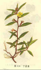 【标题】 丁香蓼 【拼音】 Dīnɡ Xiānɡ Liǎo 【拉丁文】 Ludwigia prostrata Roxb. 【异名】 丁子蓼、红豇豆、喇叭草、水冬瓜、水丁香、水苴仔、水黄麻、水杨柳、田蓼草、红麻草、银仙草、田痞草、水蓬砂、水油麻、山鼠瓜、水硼砂 【性味】 味苦;性寒 【功效】 清热解毒;利尿通淋;化瘀止血。主肺热咳嗽;咽喉肿痛;目赤肿痛;湿热泻痢;黄疸;淋痛;水肿;带下;吐血;尿血;肠风便血;疔肿;疥疮;跌打伤肿;外伤出血;蛇虫、狂犬咬伤 【药用】 为柳叶菜科植物丁香蓼的全草。 【用法用量】 内服:煎汤,15-30g;或泡酒。外用:适量,捣敷。 【形态】 一年生草本,高40-60cm。须根多数;幼苗平卧地上,或作倾卧状,后抽茎直立或下部斜升,多分枝,有纵棱,略红紫色,无毛或微被短毛。叶互生;叶柄长3-8mm;叶片披针形或长圆状披针形,长2-8cm,宽1-2cm,全缘,近无毛,上面有紫红色斑点。花两性,单生于叶腋,黄以,无柄,基部有小苞片2;萼筒与子房合生,萼片4,卵状披针形,长2.5-3mm,外略被短柔毛;花瓣4,稍短于花萼裂片;雄蕊4;子房下位,花柱短,柱头单一,头状。蒴果线状四方形,略具4棱,长1-4cm,宽约1.5mm,稍带紫色,成熟后室背不规则开裂;种子多数,细小,光滑,棕黄色。花期7-8月,果期9-10月。 【生态环境】 生于田间、水边、沟畔湿处及沼泽地。 【产地】 分布于江苏、安徽、浙江、江西、福建、台湾、湖北、湖南、四川、贵州等地。 【显微特征】 茎横切面:表皮为1列类方形细胞组成,外被单细胞非腺毛,并有5个向外突起的棱角。皮层窄。外侧2-3列细胞为厚角组织,内侧3-4列细胞形大,壁薄;近内皮层有少数纤维散在,壁厚木化。内皮层明显。韧皮部窄。木质部导管单个或2-3个相聚散在,壁木化;射线宽1-2列细胞。贿财薄壁细胞类圆形,贿中部常中空。本品薄壁细胞含少数草酸钙方晶。 叶横切面:上、下表皮均为1列类长方形细胞组成,外被非腺毛及腺鳞。栅栏组织不通过中脉,海绵组织排列疏松。主脉维管束外韧型,韧皮部窄;木质部导管呈放射状排列。主脉上,下表皮内侧有数列厚角细胞,薄壁细胞含草酸钙针晶,簇晶。 【化学成分】 本品含没食子酸(gallic acid)和诃子次酸三乙酯(triethylchebulaie)。 【理化鉴别】 取本品粉末1g,加乙醇15ml,回流30分钟,冷却,滤过。滤液供下列试验:1.取滤液少许,滴于滤纸上,喷以0.1%溴酚蓝的乙醇溶液,在蓝色背景上显黄色斑点。(检查有机酸)。 2.取滤液1ml,滴加1%三氯化铁溶液1滴,显蓝黑色。(检查没食子酸) 【药理作用】 丁香蓼水提取物去除鞣质后分离得到没食子酸和诃子次酸三乙酯,体外抗菌试验证实对宋内、舒氏、鲍氏、志贺等痢疾杆菌及金葡球菌、绿脓杆菌等有较好的抑菌作用。 【采收加工】 秋季结果时采收,切段,鲜用或晒干。 【附方】 本品喜生水田、水边,花及子房形态与丁香相近,全草类蓼,蒴果颇似胡麻,胡麻又称油麻,因而有水丁香、丁香蓼、田蓼草、水油麻诸名。 【图片】 丁香蓼 ![]() (责任编辑:Doctor001) |