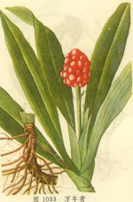 【炮制】 1.《履巉岩本草》:“晒干,为末。”2.《纲目拾遗》:“切碎,打烂,绞汁。”3.《德生堂经验方》:“磨涂。”现行,取原药材,除去杂质,洗净,润透,切厚片,干燥。 饮片性状:本品为圆形或类圆形厚片,表面类白色或淡棕色,散有黄色维管束斑点;周边散有圆点状须根痕,质韧,气微,味甜微苦涩。贮干燥容器内,置通风干燥处。 【性状】 1.性状鉴别 根茎圆柱形,长5-18cm,直径1.5-2.5cm。表面灰黄色,皱缩,具密集的波状环节,并散有圆点状根痕,有时留有长短不等的须根;顶端有时可见地上茎痕和叶痕。质带韧性,折断面不平坦,黄白色(晒干品)或浅棕至棕红色(烘干品),略带海绵性,有黄色维管束小点散布。气微,味苦、辛。以大小均匀。色白者为佳。 2.显微鉴别 根茎横切面:木栓细胞数列。皮层较宽广,有的细胞含草酸钙针晶束;内皮层明显。中柱维管束周木型和外韧型,散列,靠内皮层处的维管束较密,几排列成环。 【附方】 《纲目拾遗》:“取其四季长青,有长春之义。”故有万年青、冬不雕草、千年润,亦作千年蒀。《植物名实图考》谓九江俚医“隐其名称为开口剑,或谓能治蛇伤,亦呼为轨蛇剑。”盖其叶长如剑形,故得剑名。浆果熟时呈橘红色,故称状元红。 【参考文献】 1.《花镜》:“万年青,一名蒀。阔叶丛生,深绿色,冬夏不萎。吴中人家多种子,以其盛衰占休咎。造层移居,行聘治扩,小儿初生,一切喜事,无不用之,以为祥瑞口号,至于结姻币聘,虽不取生者,亦必剪造绫绢,肖其形以代之。又与吉祥草、葱、松四品,并列盆中,亦俗套也。种法:于春、秋二分时,分栽盆内,置之背阴处。俗云:"四月十四是神仙生日,当删剪旧叶,掷之通衢行,令人践踏,则新生叶发生必盛。"喜壅肥土,浇用冷茶。”2.《纲目拾遗》:“浙婚礼多用之伴礼函,取其四季常青,有长春之义。” 【附注】 作万年青药用的尚有同属植物金边万年青 Rohdeajaponica(Thunb.)Roth var.variegata Hort.多为栽培。 【图片】 万年青 ![]() (责任编辑:Doctor001) |
