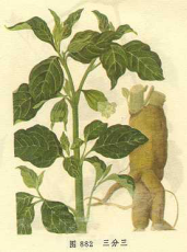【标题】 三分三 【拼音】 Sān Fēn Sān 【英文】 Acutangular Anisodus Root 【拉丁文】 1.Anisodus acutangulus C. Y. Wu et C. Chen ex C. Chen et C. l. Chen [Scopolia acutangula C. Y. Wu et C. Chen]2.Anisodus luridus Link et Otto.3.Anisodus luridus Link et Otto Otto var .fischeri-anus (Pascher) C. Y. Wu et C. Chen ex C. Chen et C. L. Chen [A 【异名】 大搜山虎、山野烟、野烟 【性味】 味苦;辛;性温;大毒 【功效】 解痉镇痛;祛风除湿。主胃痛;胆;肾;肠绞痛;风湿关节疼痛;腰腿痛;跌打损伤 【药用】 为茄科植物三分三、钤铛子、丽江山莨菪、齿叶赛莨菪等的根或叶。 【注意】 心脏病、心脏衰弱者忌服。 【用法用量】 内服:煎汤,0.6-0.9g,或研末。外用:适量,研末酒调敷;或浸酒搽。 【形态】 多年生草本,高1-1.5m。主根粗大。叶互生,叶柄长5-15mm;叶片卵形或椭圆形,长8-20cm,宽3-8cm,先端渐尖,基部楔形,全缘或波状。花单生叶腋,淡黄绿色,下垂;花梗长1-3.5cm;花萼漏斗状钟形,长3-4cm,具10条纵脉,萼齿4-5,狭三角形,不整齐;花冠漏斗钟形,5裂,淡黄绿以,开花时外反,管内被柔毛,近基部有5对暗紫斑;雄蕊5,内藏;雌蕊稍长于雄蕊,子房圆锥形,柱头头状;花盘盘状。蒴果近球形,嘀咕以下环裂;宿存萼紧包果,长3.5-4.5cm,有10条突起的纵脉,果梗长5-7cm,下弯。花期6-7月,果期10-11月。 本种与三分三我不同点在于:植株被毛。叶片全缘。花萼被柔毛,萼脉弯曲;花冠通常浅黄色或裂片略带紫色,花冠筒内基部无紫斑。 本变种与前者的主要区别是:叶缘具1-2对不等的粗齿或呈波状,有时具疏缘毛;枝条及叶被疏柔毛,或有时几无毛;花冠裂片常带褐紫色,药冠管内基部具5块紫斑。花萼和花梗密被淡褐色毛。花期6月。果期9月。 多年生草本,高50-150cm。全株无毛;茎绿色,有时带淡紫色,略具棱角。根断面淡黄色,有苦味。叶互生;叶柄长1.5-2cm;叶片纸质,椭圆形或卵状椭圆形,长6-12(-20)cm,宽3-6(12)cm,先端急尖至渐尖,基部楔形或微下延,全缘或微波状。花单生于叶腋,下垂,花梗长1.7-2.5cm;花萼钟状,厚,近革质,长约2cm,先端平齐,边缘具不规则的浅齿,常因花冠伸展被撑破为1-2深裂,纵脉不明显;花则的浅齿,常因花冠伸展被撑破为1-2深裂,纵脉不明显;花冠浅黄绿色,长约4.5cm,檐部具5齿,齿渐尖,花幕开时外反,里面花丝基部两侧具暗色紫斑;雄蕊5,长达花冠之一半或略短;雌蕊稍长于雄蕊,子房圆锥形或近球形,柱头头状。蒴果近球形,宿存萼紧包果实,盖裂,纵脉粗而不明显。种子多数,表面密布蜂窝状小孔。花期5-6月,果期9-10月。 本变种与赛莨菪的主要区别是:叶缘常具1-2(-3)个粗齿,花冠檐部裂片极浅,背面具明显的暗紫色条纹。花期5-6月。果期9-10月。 【生态环境】 生于海拔2700-3100m的林缘、草地和阴湿处。 生于山坡草地、林缘及田野宅旁。 生于海拔2800-3100m的山坡及灌木林中。 生于海拔3000-3600m的山坡、草丛或灌木丛中。 生于海拔3000-3600m的林缘或草坡。 【产地】 分布于云南西北部、四川。 分布于云南、西藏。 分布鞋于云南西北部、西藏等地。 分布于四川、云南。 分布于四川、云南。 【栽培】 生物学特性 喜凉爽气候,耐寒。在年平均气温为10.6℃,年雨量1126.8mm,年平均相对湿度78%左右的环境下生长良好。对土壤要求并不严格,除重质粘土及低洼沼泽地外均能生长,但在土层瘠薄的地区及盐碱地,植株生长迟缓,生热较差。 栽培技术 用种子繁殖,直播或育苗移栽法。春季选用上年采收的种子,形沟条播,沟距15-20cm,沟内先施腐殖质土加少量饼肥,作底肥,用经充分腐熟的堆肥工厩肥亦可。播后覆土2cm,盖薄层草,浇水,经常保持土壤湿润。待子叶出土后逐渐揭去盖草,另用竹竿拾起高20cm的棚架,上盖草或篾笆,了止曝晒。约2星期左右出苗。每1hm2用种量300g,可育苗30000-3700株。苗高5-8cm,时移栽,行株距50cm×40cm。 田间管理 生长期注意松土和锄草。在丽江地区,根据红壤贫瘠的特点,主要以施有机肥为主,用粪水充分沤熟的油饼粕,以1份肥兑6份清水施于根部,于定植后20-25d后追施,第2次追肥是在8月中旬,可施复合颗粒肥,每1hm2150-225kg。2-3年生植株,第1次追肥在5月中旬,第2次在7月。入冬前应注意培土防寒防冻,培土厚10cm左右。 病虫害防治 病害有霜霉病,6-9月发生,为害叶部。发病初期用70%甲基托布津1000倍液或40%霜疫灵300倍液喷洒,10-14d1次,连续2-3次,同时雨后注意排水;虫家有八字地老虎、小地老虎、金龟子、金针虫等地下害虫为害。防治方法主要采用人工捕杀、毒饵诱杀法。 【显微特征】 根横切面:木栓层较厚。韧皮部狭窄。木质部占大部分,导管2-8成群,放射状排列,有木间韧皮部。薄壁细胞含草酸钙砂晶。 【化学成分】 1.三分三 茎含总生物碱0.72%,其中山莨菪碱(anisodamine)0。38%,莨菪碱(scopolamine)0.22%和莨菪碱(hyoscyamine)0.12%。叶含总生物碱0.72%,其中莨菪碱0.27%,东莨菪碱0.24%,山莨菪碱0.215[1];果实含总生物碱1.15%,其中莨菪碱为0.96%,东莨菪碱为0.19%;以及微量托品碱(tropine)。种子含总碱1.06%,其中莨菪碱为0.88%,东莨菪碱为0.17%以及微量托品碱[2]。 2.钤铛子 茎、叶,均含有阿托品(atropine)[3],莨菪碱、东莨菪碱及微量托品碱,茎中含莨菪碱0.22%-0.59%,东莨菪碱0.05%-0.32%,去水阿托品(apoatropine)0。01%,托品碱0.03%;叶中含莨菪碱0.13%-0.51%,东莨菪碱0.06%-0.17%,托品碱(0.01%)[1]。根含莨菪碱,东莨菪碱,红古豆碱(cuscohygrine)[2],阿托品等[3],根还含东莨菪素(scopoletin)[14]. 【理化鉴别】 取本品粉末1g,置带寒锥形瓶中,用氨水