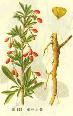 (2)刺黑珠根 粉末棕黄色。①韧皮纤维众多,淡黄色,梭形,末端钝圆,直径20-49um,长144-242um,孔沟明显。②木纤维淡黄色,成束,直径10-31um,长215-390um,nk檗较薄,有稀疏孔沟及纹孔。③石细胞淡黄色,类长三角形、类图形或类长方形,直径27-62um,长可达119um,檗厚,孔沟明显。④草酸钙方晶较多。⑤导管主为具缘纹孔及网纹导管,直径16-53um。⑥木栓细胞多角形,壁木化。 (3)蓝果小檗根 粉末棕黄色。①草酸钙方晶直径8-29um,多存在于韧皮射线细胞中可见多个上方晶。 ②韧皮纤维黄色,梭形,末端稍钝,直径17-39um,长110-237um,壁厚,木化,孔沟明显,胞腔狭或较宽。③木纤维多碎断,直径10-25um,长254-846um,壁薄,可见斜纹孔。④石细胞黄色,类长方形、类三角形或不规则形,长径可达218um,壁厚,孔沟明显,有时孔沟呈分技状。⑤导管主为具缘纹乱和网纹导管,直径14-4lum,导管分子末端长尾状。⑥木栓细胞类多角形,壁微木化。 【化学成分】 1.细叶小檗根含小檗碱(berberine)1.16%,小檗胺(berbarmine)2.7%,还含掌叶防已碱(Palmatine),药根碱(jatrorrhizine)。 2.刺黑珠根含小檗碱3.68%,小檗胺1.82%,还含掌叶防已碱,药根碱。 3.蓝果小檗茎含小檗碱1.08%,还含掌叶防已碱,药根碱及小檗胺。 4.猫刺小檗根含小檗碱2.31%,小檗胺3.84%,还含掌叶防已碱及微量药碱。 5.匙叶小檗根含小檗碱1.58%,小檗胺0.81%,还含掌叶防已碱、药根碱。 此外,同属植物贵州小檗根含小檗碱。秦岭小檗根含小檗碱2.67%,小檗胺1.16%,还含掌叶防已碱,药根碱。拟多花小檗根含小檗碱1.40 %,小檗胺1.33%,还含药根碱及微量掌叶防己碱。细脉小檗根含小檗碱0.93%,小檗胺1.24 %,还含掌叶防已碱,而药根碱呈痕迹反应。刺红珠根含小檗碱1.04 %,还含掌叶防已碱,而小檗胺呈痕迹反应。首阳小檗根内皮含小檗碱3.36%,还含小檗胺。大黄檗根含小檗碱1.43%,小檗胺0.91%,含微量掌叶防己碱及药根碱。果实含维生素C249.8mg%。 巴东小檗根含小檗碱1.23 %,小檗胺0.84%,还含掌叶防已碱,药根碱,皮部小檗碱4.16%。显脉小檗根含小檗碱2.8%,还含小檗胺,异粉防已碱(isotetrandrine)及微量掌叶防已碱。网脉小檗根含小檗碱2.37%,还含掌叶防已碱及药根碱。血红小檗根含小檗碱2.8%。还含掌叶防己碱,药根碱及小檗胺。华西小檗茎含小檗碱1.5%,小檗胺0.70%,还含掌叶防已碱。 【理化鉴别】 (1)取本品粉末少许置于载玻片上,滴加 5%盐酸1滴,加盖玻片,放置片刻,镜检,可见大量黄色针状结晶簇。 (检查小檗碱)(2)取粉末0.5g,加少量水浸泡,取上清液ml,加稀盐酸数滴,再滴加改良碘化铋钾试剂,立即呈橘红色沉淀。(检查生物碱)取上清液2ml,沿管壁加溴水1ml,两液交界处显樱红色环。(检查小檗碱)(3)取粉末0.5g,加甲醇浸泡30min,取上清液2ml,蒸至近干,加5%没食子酸乙醇溶液2-3滴,置水浴上蒸干,趁热加硫酸数滴,将溶液置于白瓷板上观察,显墨绿色。(检查小檗碱)(4)薄层色谱取本品细粉0.5g,甲醇回流提取。提取液浓缩后供点样用。硅胶9g,加石膏1g和一定量水铺后,120℃活1.5h。展开剂(甲)氯仿一甲醇一氨(15:4:1);(乙)乙酸异戊酯一甲酸一无水醇(70:2o:10)。展开2次,展距16m。紫外光灯下观察,小檗碱和掌叶防已碱显黄绿色荧光,药根碱为暗斑,小檗胺呈淡蓝荧光。再用改良碘化铋钾试剂显色,色点均呈污红棕色斑点。 【药理作用】 同属植物三棵针Berberisspp.含小檗碱,其药理见黄连条。粗制剂的药理作用1.降压作用 麻醉猫腹腔注射三棵针流浸膏有显着的降压作用,对呼吸和心率的影响不显着。静脉注射三棵针的各种提取成分(一般属于季铵类生物碱,是由己提取过小檗碱的部分中分离出来的),也有显着的降压作用。三棵针代替黄檗加入二仙合剂(称针仙合剂)给麻醉猫静脉注射亦可降压,但给不麻醉的慢性肾型高血压狗灌服,连续三周并无降压作用,可能是这些成分在肠胃道不易吸收之故。三颗针浸膏2g生药/kg腹腔注射可使麻醉猫血压下降。盐酸小檗胺5、10mg/kg可使麻醉兔、猫、犬血压下降,其降压机理可能主要通过血管的直接扩张作用。 2.抗菌作用 三棵针有抗菌作用。煎剂在试管内能抑制出血性黄疸型钩端螺旋体的生长,最低有效浓度为1/800,与小檗碱相差不多。感染钩端螺旋体之豚鼠,口服煎剂,除腹壁及内脏出血较轻外并无明显效果。 3.升白作用:小檗胺20mg/kg腹腔注射及2mg/kg静脉注射,分别对大鼠和犬因环磷酰胺引起的白细胞下降有对抗作用。 4.抗心律失常:盐酸小檗胺12.5、50?mol/kg对离体豚鼠乳头状肌和人心耳梳状肌的收缩性、自律性有抑制作用,并延长功能不应期及非竞争性的拮抗氯化钙的正性肌力作用;盐酸小檗胺5mg/kg静脉注射对乌头碱、哇巴因、氯化钙及结扎冠脉引起的心律失常均有抑制作用,小檗胺抗心律不齐的机理可能是抑制钙内流。小檗胺1?mol/L,可使兔离体心脏缺血再灌注引起的心功能损伤有保护作用,能促进心功能的恢复,延长心脏有效工作时间。 【采收加工】 根于春、秋两季采收,除去须根,洗净,切片,烤干或弱太阳下晒干,不宜曝晒.式枝全年可采。 【炮制】 采集后,取茎枝刮去外皮,剥取深黄色的内皮,阴干。 【中毒处理】 小鼠腹腔注射三棵针流浸膏,半数致死量为3.1g/kg。肾型高血压狗每天灌服针仙含剂15g生药/kg,共15日,第16-20日剂量增为30g/kg,血压、心电图、肝肾机能均未见显着改变。3只狗停药之周后,又给流浸膏10g/kg,每天1次共2周,同样未见变化。提取物B-19生物碱给猫灌服100mg/kg,大鼠每天灌服400mg/kg,共