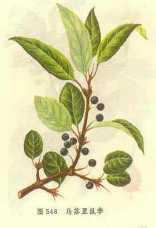 【标题】 乌苏里鼠李树皮 【拼音】 Wū Sū Lǐ Shǔ Lǐ Shù Pí 【拉丁文】 Rhamnususs uriensis J.Vass. 【性味】 苦;寒 【功效】 清热通便。主热结便秘 【药用】 为鼠李科植物乌苏里鼠李的树皮。 【用法用量】 内服:煎汤,3-10g。 【形态】 乌苏里鼠李 灌木,高达5m。全株无毛。小枝灰褐色,有光泽,枝端常有刺。叶对生或近对生,或簇生于短枝端;叶柄长1-2.5cm;托叶披针形,早落;叶片狭椭圆形或狭长圆形,长3-10cm,宽1.5-3.5cm,先端锐尖,基部楔形或圆形,稍偏斜,边缘具锯齿,齿端常有紫红色腺体,两面无毛,侧脉4-5对,网脉明显。花单性,雌雄异株;雌花数个至20余个簇生于长枝下部叶腋或短枝顶端,萼片4,卵状披针形,有退化雄蕊;花瓣4;花柱2浅裂或近半裂。核果球形或倒卵状球形,直径5-6mm,成熟时黑色,具2分核,基部有宿存萼筒,果柄长6-10mm,种子卵圆形,背面有狭沟。花期4-6月,果期6-10月。 【生态环境】 生于海拔1600m以下的河边、山地林中或山坡灌丛中。 【产地】 分布于东北及内蒙古、河北、山东。 【采收加工】 春、夏季采收,晒干。 【图片】 乌苏里鼠李 ![]() 乌苏里鼠李树皮 (责任编辑:Doctor001) |