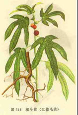 【标题】 五指毛桃根 【拼音】 Wú Zhǐ Máo Táo Gēn 【异名】 南芪、土黄芪(广州空军《常用中草药手册》),土五加皮(《广西中草药》)。 【性味】 ①广州部队《常用中草药手册》:"辛甘,微温。" ②广州空军《常用中草药手册》:"味甘淡,性平。" 【功效】 健肿补肺,行气利湿。治肺痨咳嗽,盗汗,肢倦无力,食少腹胀,水肿,风湿痹痛,肝炎,白带,产后无乳。 ①广州部队《常用中草药手册》:"健脾化湿,行气止痛,除痰止咳。治肝硬化腹水,慢性肝炎,肝脾作痛,水肿,风湿性关节炎,劳伤咳嗽。" ②广州空军《常用中草药手册》:"益气固表,舒筋活络,行气化湿。治肺结核咳嗽,慢性支气管炎,盗汗,病后体弱,产后无乳,妇女白带,胃痛,胸痛,无名肿毒。" 【药用】 为桑科植物粗叶榕的根。秋季采挖,洗净,切片,晒干。 【用法用量】 内服:煎汤,1~2两。 【形态】 粗叶榕,又名:三龙爪、亚桠木、五指毛桃、五爪龙、五指牛奶。 灌木或小乔木。嫩枝中空,全株被灰色绒毛。单叶互生,纸质,多型,长椭圆状披针形、狭或广卵形,长8~25厘米,宽4~18厘米,先端急尖或渐尖,基部圆形或心形,常具3~5深裂,边缘有锯齿或呈波状,有时全缘;托叶卵状披针形,长8~20毫米。花序成对腋生,球形,基部苞片卵状披针形;花黄绿色;雄花生于花序内壁近顶部,具梗;萼片4,紫色,线状披针形;雄蕊2或1枚;瘿花的萼片与雄花的相似;子房球形或卵形,花柱侧生,柱头漏斗形;雌花生于另一花序内,具梗或近无梗;萼片与雄花的相似,但较狭,颜色也较淡。瘦果椭圆形,有小瘤状凸体。 【产地】 生于山坡、沟谷、路旁的灌木丛中。分布我国南部及西南部。 【附方】 ①治急性黄疸型肝炎、较重的慢性肝炎:穿破石二市斤,五指毛桃半市斤,葫芦茶三两,加水浸煮两次,浓缩至1500毫升,加白糖300克,入防腐剂,静置,过滤。较重者每天服90毫升,分二次服;轻者,每天服45毫升,一次服完.以一个月为一疗程,(广州市卫生管理局《新医药通讯》(2):18~19,1972) ②产后无乳:五指牛奶2两,炖猪脚服。(《广西中草药》) ③白带:五指牛奶1两,一匹绸2两,水煎服。(《广西中草药》) 【图片】 五指毛桃根 ![]() 粗叶榕 (责任编辑:Doctor001) |