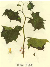 【标题】 八角枫 【拼音】 Bā Jiǎo Fēnɡ 【异名】 白金条[侧根名]、白龙须[须状根名]、八角王、八角梧桐、八角将军、割舌罗、五角枫、七角枫、野罗桐、花冠木 【性味】 辛,微温。有毒。 【功效】 祛风除湿,舒筋活络,散淤止痛。用于风湿关节通,跌打损伤,精神分裂症。 【药用】 为八角枫科八角枫属植物华瓜木 Alangium chinense (Lour.) Rehd. 及瓜木 A. platanifolium (Sieb. et Zucc.) Harms. 以侧根、须状根(纤维根)及叶、花入药。根全年可采,挖出后,除去泥沙,斩取侧根和须状根,晒干即可。夏、秋采叶及花,晒干备用或鲜用。 【注意】 有毒!孕妇忌服,小儿和年老体弱者慎用。 【用法用量】 侧根1~3钱,用量由小逐渐加大,切勿过量;须根一般不超过1钱,宜在饭后服用。 【形态】 1.华瓜木:落叶灌木或小乔木,高4~5米。树皮淡灰黄色,平滑,小枝圆形,灰黄色,具淡黄或褐色粗毛,皮孔不明显。单叶互生,有柄;叶形变异较大,常卵形、圆形或椭圆形,长5~18厘米,宽4~12厘米,先端长尖,基部偏斜,平截,略成心形,全缘或少为上部3~5浅裂,主脉5条,下面常有脉腋丛毛。夏、秋开白色花,渐变为乳黄色;3~15朵乃至30余朵成腋生聚伞圆锥花序,花序梗长6~15毫米,花梗密生细毛;萼广钟形,口缘有纤毛,萼齿6~8;花瓣与萼齿同数互生,条形,常由顶端反卷;雄蕊与花瓣同数,等长,花丝粗短,扁形,密被毛茸,花药条形,长为花丝的3倍,花盘圆形,位于子房顶;子房下位,2室,每室胚珠1个,花柱细长,柱头3浅裂。核果卵形,长约1厘米,熟时黑色,顶端具宿存萼齿及花盘。种子1粒。生于山野路旁、灌木丛或杂木林中。分布于陕西、甘肃、江苏、安徽、浙江、江西、福建、河南、湖北、湖南、广东、四川、贵州、云南等省。 2.瓜木:与华瓜木很相似,但叶片通常明显4~7裂,基部心形,下面有疏毛。花序上的花较少,通常2至数朵。成熟核果较小。生于山地林边。分布于辽宁、河北、山西、安徽、浙江、江西、福建、台湾、河南、湖北、湖南、四川、贵州、云南等省。 【附注】 (1).八角枫须状根(白龙须)毒性较大,中毒轻者有头昏、无力,重者可因呼吸抑制而致死。在抢救中首先要考虑作人工呼吸,其他对症治疗亦需及时。作肌肉松弛剂使用时,更应在有抢救条件的医院进行。 (2).据报道试用八角枫叶2两,水煎分早晚服。治疗浸润型肺结核有一定疗效。 【图片】 八角枫 ![]() (责任编辑:Doctor001) |