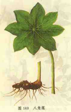 【标题】 八角莲 【拼音】 Bā Jiǎo Lián 【英文】 Common Dysosmatis Rhizome and Root,Sixangular Dysosma Rhizome and Root, Rhizome and root of Sixangular Dysosma,Rhizome and root of Veitch Dysosma 【拉丁文】 1.Dysosma versipellis(Hance)M.Cheng ex Ying2.Dysosma pleiantha (Hance)Woods.[D.hispida(Hao)Chun]3.Dysosma veitchii(Hemsl.et Wis.)Fu ex Ying 【异名】 鬼臼、爵犀、马目毒公、九臼、天臼、解毒、害母草、独脚莲、独荷草、羞天花、术律草、琼田草、山荷叶、旱荷、八角盘、金星八角、独叶一枝花、八角连、金魁连、八角乌、白八角莲、金边七 【性味】 味苦;辛;性凉;有毒 【归经】 肺;肝经 【功效】 化谈散结;祛瘀止痛;清热解毒。主咳嗽;咽喉肿痛;瘰疬;瘿瘤;痈肿;疔疮;毒蛇咬伤;跌打损作;痹证 【药用】 为小檗科植物八角莲、六角莲和川八角莲的根及根茎。 【注意】 孕妇禁服,体质虚弱者慎服。 【用法用量】 内服:煎汤,3-12g;磨汁,或入丸、散。外用:适量,磨汁或浸醋、酒涂搽;捣烂敷或研末调敷。 【形态】 1.八角莲,多年生草本,茎直立,高20-30cm。不分枝,无毛,淡绿色。根茎粗壮,横生,具明显的碗状节。茎生叶1片,有时2片,盾状着生;叶柄长10-15cm;叶片圆形,直径约30cm,常状深裂几达叶中部,边缘4-9浅裂或深裂,裂片楔状长圆形或卵状椭圆形,长2.5-9cm,宽5-7cm,先端锐尖,边缘具针刺状锯齿,上面无毛,下面密被或疏生柔毛。花5-8朵排成伞形花序,着生于近叶柄基处的上方近叶片处;花梗细,长约5cm,花下垂,花冠深结色;萼片6,外面被疏毛;花瓣6,勺状倒卵形,长约2.5cm;雄蕊6,蕴含隔突出;子房上位,1室,柱头大,盾状。浆果椭圆形或卵形。种子多数。花期4-6月,果期8-10月。 2.六角莲,多年生草本,茎直立,无毛,高10-20cm。根茎粗壮,节明显。茎生叶通常2,对生,盾状着生;叶柄长10-15cm,无毛;叶片长圆形或近圆形,长16-22cm,宽9-18cm,无毛6-9浅裂,裂片宽三角状卵形,边缘有针状细齿。花5-10朵排成伞形花序,生于两茎叶柄的交叉处,花梗长2-3(-6)cm,花下垂;萼片6,卵状或椭圆状长圆形,花瓣6,紫红色,长圆形,长2.5-3.5cm,宽1-1.5cm;雄蕊6,长1.2-2.3cm,花药长圆形,先端钝;子房上位,1室,花柱短,柱头盾状。浆果近球形。花期5-6月,果期8-9月。 3.川八角莲,多年生草本,茎多汁,高10-20cm。基部密被棕色大鳞片。叶互生,纸质,2片,盾状着生;叶片圆形,直径约20cm,通常6-8掌状深裂几达中部,裂片楔状矩圆形,先端常3裂,小裂片三角形,上面无毛,叶中部红棕色,下面叶脉有疏柔毛,后变无毛。伞形花序有2-6朵花,丛生于茎顶叶柄分叉处的腋间(稀有腋外生),花梗长1.5-2cm,有柔毛;萼片6,膜质,长圆状披针形,长4-5cm,有时可达6cm;雄蕊6,花药先端具细尖;子房1室,胚珠多数,花柱短粗,柱头大而呈流苏状。浆果卵形,红色,长约3cm。花期4-6月,果期8-10月。 【生态环境】 1.生于海拔300-2200m的山坡林下阴湿处。有少量栽培。 2.生于海拔600-1600m的山坡林下阴湿处,或有少量栽培。 3.生于海拔1200-2200m的山地阴湿林下。 【产地】 1.分布于浙江、江西、河南、湖北、湖南、广东、广西四川、贵州、云南等地。 2.分布于安徽、浙江、福建、台湾、河南、湖北、湖南、广西、四川、云南等省地。 3.分布于四川、贵州、云南。 【栽培】 生物学特性,喜阴凉潮湿,忌强光、干旱。适宜选择富含腐殖质、肥沃的砂质壤土栽种。 栽培技术,用种子繁殖或分株繁殖。种子繁殖:8-9月采集成熟果实,搓去外皮,收集种子。穴作业,覆草保温。分株繁殖:2-3月挖取老根茎,截成12-15cm长小段,按行株距各30-35cm穴栽,每穴1段,覆土,浇水定根。4-11月均可移栽。 田间管理,可利用林下空地阴凉处栽培,如无良好自然荫蔽条件,则需搭矮棚遮荫。生长期注意浇水,保持土壤湿润。春季多施氮肥,夏季多施腐熟有机肥。秋、冬季以厩肥、草原灰湿合培土越冬。 病虫害防治,红蜘啤酒用20%双甲眯乳油1000倍液喷杀。 【化学成分】 根和根茎含抗癌成分鬼臼毒素(Podophylloto-xin)和脱氧鬼臼毒素(Deoxypodophyllotoxin)。此外,尚分离出黄耆甙(AstragaIin)、金丝桃甙(Hyperin)、槲皮素(Quercetin)、山柰酚(Kaempferol)和谷甾醇。 1.八角莲根茎及根含树脂约4.2%,从中分得鬼臼毒素(鬼臼毒素,足叶草素,podophyl-lotoxin)、脱氧鬼臼毒素(deoxypodophyllotoxin)、4ˊ-去甲鬼臼毒素(4ˊ-demethylpodophyllotoxin、?-盾叶鬼臼素(?-peltatin)、?-盾叶鬼臼素(?-peltatin)、鬼臼毒酮(podophyl-lotoxone)、4ˊ-去甲异鬼臼苦酮(4ˊ-demethyl-isopicrop-odophyllone)、鬼臼苦酮(picropodophyllone)、去氢鬼臼毒素(dehydropodophyllotoxin)以及鬼臼毒素-4-O-葡萄糖甙。另含山柰酚等。 2.六角莲根茎根含鬼臼毒素、4ˊ-去甲鬼臼毒酮、去氧鬼臼毒素、鬼臼毒酮、4ˊ-去甲鬼臼毒酮(4ˊ-demethylpodophyllotoxone)、异鬼臼苦酮(isopicropodophyllone)、鬼臼苦素(picropodophyllin)、鬼臼苦酮(picropodophyllone)、山荷叶素(di-phyllin)、去氢鬼臼毒素(dehy-dropodophyllotoxin)、尚含大黄素甲醚(physcion)、山柰酚、槲皮素、紫云英甙等。 【理化鉴别】 薄层层析:本品的乙醇提取液为供试液,另取鬼臼毒素乙醇液为对照品溶液,吸取供试液、对照品溶液,分别点于同一硅胶G薄层板上,以氯仿-甲醇(9:1)展开18cm,硫酸-乙醇(1 :1)喷雾,120℃烘烤5分钟,显深棕色斑点。 【药理作用】 1.心肌作用:根中提出的结晶性物质,作用类似足叶草素,对离体蛙心有兴奋作用,能使其停于收缩状态。 2.血管作用:对兔耳血管有扩张作用;对蛙后肢血管、家兔小肠及肾血管则有轻度的收缩作用。 3.平滑肌作用:抑制离体