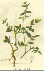 【标题】 六月雪 【拼音】 Liù Yuè Xuě 【异名】 白马骨、满天星[江苏、广东]、路边姜、天星木、路边荆、鸡骨柴 【性味】 淡、微辛,凉。 【功效】 疏风解表,清热利湿,舒筋活络。用于感冒,咳嗽,牙痛,急性扁桃体炎,咽喉炎,急、慢性肝炎,肠炎,痢疾,小儿疳积,高血压头痛,偏头痛,风湿性关节痛,白带;茎烧灰点眼治眼翳。 【药用】 为茜草科六月雪属植物六月雪Serissa serissoides (DC.) Druce,以全株入药。全年可采。洗净鲜用或切段晒干。 注:同属植物白马骨Serissa foetida Comm.亦作六月雪入药,功效相似。 【用法用量】 0.5~1两。 【形态】 常绿小灌木,高通常1米,多分枝,根细长,外皮黄色。枝粗壮,灰白色或青灰色,嫩枝有微毛,揉之有臭味。叶对生或丛生于短枝上,近革质,倒卵形,椭圆形或倒披针形。8月开白色小花。核果小,球形。 【图片】 六月雪 ![]() (责任编辑:Doctor001) |