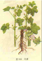 【标题】 冬葵果 【拼音】 Dōnɡ Kuí Guǒ 【英文】 FRUCTUS MALVAE 【异名】 冬葵子 【性味】 甘、涩,凉。 【功效】 清热利尿,消肿。用于尿闭,水肿,口渴;尿路感染。 【药用】 本品系蒙古族习用药材,为锦葵科植物冬葵Malva verticillata L. 的干燥成熟果实。夏、秋二季果实成熟时采收,除去杂质,阴干。 【贮藏】 置阴凉干燥处。 【用法用量】 3~9g。 【理化鉴别】 (1) 本品宿萼表面观:下表皮星状毛由 2~ 8个(多由 4~ 8个)细胞组成,单个细胞长50~1140μm,直径约75μm,壁稍厚;腺毛头部椭圆形,5 ~7 个细胞,直径25~38μm。上表皮单细胞非腺毛细长,弯曲或平直,长约至1190μm,壁薄或稍厚。上下表皮气孔均为不等式。叶肉薄壁细胞含草酸钙簇晶,直径 6~25μm,棱角较尖。 本品果皮横切面:外果皮为一层长方形表皮细胞,壁稍厚,外被角质层。中果皮由2 ~3 层类圆形薄壁细胞和一层含草酸钙棱晶的细胞组成,薄壁组织中有大型黏液细胞散在。含晶细胞类圆形,壁厚且木化。中果皮与内果皮间有 10 余束纤维束,呈环状排列。内果皮为一列径向延长的石细胞,呈栅栏状,侧壁及内壁甚厚,木化。 (2) 取本品粉末2g,加水20ml,振摇15分钟,滤过。取滤液加活性炭1g,置水浴上加热15分钟,滤过。取滤液2 ml,加碱性酒石酸铜试液4 滴,置水浴上加热5 分钟,生成棕红色沉淀;另取滤液2 ml,加10%α-萘酚乙醇溶液 3滴,摇匀,沿管壁加硫酸0. 5ml,两液接界处显紫红色环。 【性状】 本品呈扁球状盘形,直径4~7mm,外被膜质宿萼。宿萼钟状,黄绿色或黄棕色,有的微带紫色,先端5齿裂,裂片内卷,其外有条状披针形的小苞片3片。果梗细短。果实由分果瓣10~12枚组成,在圆锥形中轴周围排成1轮,分果类扁圆形,直径1.4~2.5mm,表面黄白色或黄棕色,具隆起的环向细脉纹。种子肾形,棕黄色或黑褐色。气微,味涩。 【附注】 (1)用治小便淋沥涩痛,常与车前子、海金沙等同用;又能利水通淋,用治水肿,常与茯苓等药配合同用。产妇乳汁稀少,乳房胀痛等症,常与木通、通草同用。也可治疗大便干燥的病症。 【图片】 冬葵 ![]() 冬葵《本草纲目》 ![]() 冬葵果 ![]() 药材冬葵果 ![]() 药材冬葵果宿萼表面观示星状毛与草酸钙簇晶 ![]() 药材冬葵果宿萼表面观示星状毛与草酸钙簇晶(偏振光下) ![]() 药材冬葵果果皮横切面 ![]() (责任编辑:Doctor001) |