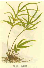 【标题】 凤尾草 【拼音】 Fènɡ Wěi Cǎo 【异名】 井口边草(《本草拾遗》),小金星风尾、铁脚鸡(《履巉岩本草》),山鸡尾,井茜(《生草药性备要》),井阑草、石长生(《植物名实图考》),凤凰草(《分类草药性》),井边茜(《岭南采药录》),旋鸡头、阉鸡尾(《中国药植志》),凤尾蕨、野鸡尾(《广西中兽医药植》),青蕨(《陆川本草》),鸡脚草(《南宁市药物志》),百脚草、龙须草(《江西民间草药》),金鸡尾、腊肾草(《四川中药志》),百脚鸡(《中国药植图鉴》),金鸡爪、井口鸡胶舌(《闽东本草》),井栏茜、小叶凤尾草(《广东中药》Ⅱ),小风尾(广州空军《常 【性味】 味淡微苦,性寒。 ①《生草药性备要》:"味辛,性平。" ②《分类草药性》:"性凉,无毒。" ③《福建民间草药》:"咸,寒,微毒。" ④《本草推陈》:"酸苦,寒。" ⑤广州部队《常用中草药手册》:"甘淡微苦,寒。" 【归经】 ①《泉州本草》:"入肾、胃二经。" ②《闽东本草》:"入大肠、肾、心、肝四经。" 【功效】 清热利湿,凉血止血,消肿解毒。治黄疸型肝炎,肠炎,菌痢,淋浊,带下,吐血,衄血,便血,尿血,扁桃体炎,腮腺炎,痈肿疮毒,湿疹。 ①《生草药性备要》:"洗疳、疗、痔,散毒,敷疮。""治蛇咬诸毒,刀伤,能止血生肌,舂汁调酒服,渣敷患处。研末收贮治气痛。" ②《岭南采药录》:"晒干为末,治气痛热痛。" ③《植物名实图考》:"治五淋,止小便痛。" ④《分类草药性》:"治一切热毒,消肿,清火。治痈疮,乳痈,淋症。" ⑤《中国药植志》:"止泻。" ⑥《贵州民间方药集》:"解热,利尿。治小儿惊风,夜哭。" ⑦《广西药植志》:"清大肠、肺热。治热性赤痢及齿痛,止吐血。" ⑧《中国药植图鉴》:"治疥癣。" ⑨《泉州本草》:"治湿热小便不通,血淋,咽喉肿痛。" ⑩《湖南药物志》:"治疳积,感冒,目翳。" ⑾广州部队《常用中草药手册》:"清热,利湿,凉血。治菌痢,肠炎,外感发热,尿路感染,白带,腮腺炎,疔疮,湿疹。" ⑿《江西草药》:"治瘰疬,鼻衄,便血。" ⒀《上海常用中草药》:"治黄疸型肝炎,扁桃体炎,遗精,蛲虫病。" 【药用】 为凤尾蕨科植物凤尾草的全草或根。全年可采。 【应用】 ①治疗急性菌痢 成人每日取全草25~30克(最多可用2两小儿酌减),加水200~250毫升,煎至约100毫升,加糖分3次服。治疗80例,多数在2~7天内退热,腹痛及里急后重消失,大便次数及性质恢复正常,大便培养转阴。于口服同时,加用煎剂作保留灌肠亦可。 ②治疗传染性肝炎 取鲜草制成100%煎液,服时加糖。成人海日100~150毫升,分2~3次服,连服1星期。治疗143例,均辅以维生素B1、C,结果除1例病情反复,20例显着进步外,均治愈。 ③治疗伤寒 取细叶风尾草(干品),成人每日4两(小儿酌减),加水2500毫升,煎成750毫升,首次服150毫升,后每隔2小时服60毫升。治疗5例(2例轻型,1例中型。2例重型),4例治愈,1例重型患者发热持续不退,改用合霉素治愈。 ④治疗胆道疾患 取凤尾草3两,加糖煎服。临床试治胆囊炎、胆结石等并发胆道出血5例,服药6~8剂后,4例获得控制,1例无效。亦可用于感染所致的胆道出血。 此外,曾报道用凤尾草、水杨梅各2两,向日葵盘1只,煎服,治疗绒毛膜上皮癌、恶性葡萄胎各1例,收到意外疗效,值得探索。 【注意】 虚寒证忌服。 ①《履崭岩本草》:"老人不可多服,其性冷故也。" ②《闽东本草》:"孕妇、冷痢、休息痢不宜服。" 【用法用量】 内服:煎汤,3~6钱(鲜品1~2两);研末或捣汁饮。外用:捣敷或煎水洗。 【形态】 风尾草,又名:细叶凤尾草。 多年生草本,高30~70厘米。地下茎粗壮,密被线状披针形的黑褐色鳞片。叶丛生,叶柄长5~23厘米,灰棕色或禾秆色,无毛;生孢子囊的孢子叶2回羽状分裂,上面绿色,下面淡绿色,中轴具宽翅,羽片3~7对,对生残近对生。上部的羽片无柄,不分裂,先端渐尖,长线形,全缘,顶端的羽片最长,下部的羽片有柄,羽状分裂或基部具1~2裂片,羽状分裂者具小羽片数枚,长线形,小羽片在叶轴上亦下延成翅,叶脉明显,细脉由中脉羽状分出,单一或二叉分枝,直达边缘;不生孢子囊的营养叶叶片较小,2回小羽片较宽,线形或卵圆形,边缘均有锯齿,孢子囊群线形,沿孢子叶羽片下面边缘着生,孢子囊群盖稍超出叶缘,膜质。 【产地】 生长于半阴湿的岩石及墙角石隙中。分布云南、四川、广东、广西、湖南、江西、浙江、安徽、江苏、福建、台湾等地。 【附方】 ①治热性赤痢:凤尾草五份,铁线蕨一份,海金砂藤一份。炒黑,水煎服。(《广西药植图志》) ②治痢疾:鲜凤尾草二至三两。水煎或擂汁服,每日三剂。(《江西草药》) ③治急性肝炎:鲜凤尾草三两。捣汁服,每日三剂,五天为一疗程。(《江西草药》) ④治泌尿系炎症,血尿:鲜凤尾草二至四两,水煎服。(广州空军《常用中草药手册》) ⑤治热淋、血淋:凤尾草七钱至一两。用米泔水(取第二次淘米水)煎服。(《江西民间草药》) ⑥治白带及五淋白浊:凤尾草二至三钱,加车前草、白鸡冠花各三钱,萹蓄草、米仁根、贯众各五钱。同煎服。(《浙江民间草药》) ⑦治崩漏:凤尾草一两。切碎,用水酒各半煎服。(《矿西中草药》) ⑧治鼻衄:凤尾草七钱至一两,海带一两(洗净)。水煎服。(《江西民间草药》) ⑨治大便下血:凤尾草七钱至一两。同猪大肠炖熟去渣,食肠及汤。(《江西民间草药》) ⑩治肺热咳嗽:鲜凤尾草一两。洗净,煎汤调蜜服,日服二次。 ⑾治咽喉肿痛:鲜凤尾草五、六钱。洗净,煎汤,冲乌糖少许,日服二