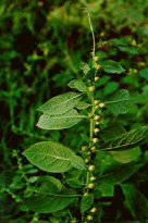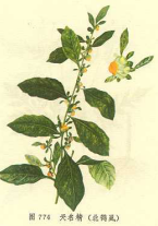 【标题】 北鹤虱 【拼音】 Běi Hè Shī 【英文】 FRUCTUS CARPESII 【性味】 苦、辛,平;有小毒。 【归经】 归脾、胃经。 【功效】 杀虫消积。用于蛔虫、蛲虫、绦虫病,虫积腹痛,小儿疳积。 【药用】 本品为菊科植物天名精Carpesium abrotanoides L.的干燥成熟果实。秋季果实成熟时采收,晒干,除去杂质。 【贮藏】 置阴凉干燥处。 【用法用量】 3~9g。 【理化鉴别】 本品横切面:外果皮细胞1 列,均含草酸钙柱晶。中果皮薄壁细胞数列,棕色,细胞皱缩,界限不清楚,棱线处有纤维束,由数十个纤维组成,纤维壁厚,木化。内果皮细胞1 列,深棕色。种皮细胞扁平,内胚乳有残存;胚薄壁细胞充满糊粉粒及脂肪油滴,子叶最外层细胞含细小的草酸钙结晶。 【性状】 本品呈圆柱状,细小,长3~4mm,直径不及1mm。表面黄褐色或暗褐色,具多数纵棱。顶端收缩呈细喙状,先端扩展成灰白色圆环;另端稍尖,有着生痕迹。果皮薄,纤维性,种皮菲薄透明,子叶2,类白色,稍有油性。气特异,味微苦。 【图片】 北鹤虱 ![]() 天名精《中药学》 天名精《本草纲目》 ![]() (责任编辑:Doctor001) |