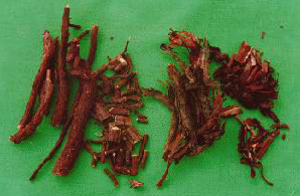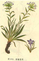 【标题】 新疆紫草 【拼音】 Xīn Jiānɡ Zǐ Cǎo 【英文】 Arnebia Root 【异名】 软紫草 【功效】 同紫草。 【药用】 为紫草科植物新疆紫草Arnebia euchr0ma(Royle)Johnst.的根。春、秋季采挖,晒干或微火烘干。 【形态】 多年生草本,高15~35cm。全株被白色硬糙毛。根圆锥形,多扭曲,紫色栓皮多层。茎直立,单一或基部分成二歧。基生叶丛生,叶条状披针形,长约13cm,全缘,黄绿褐色;茎生叶互生,较少,短小 。花集结成聚伞花序,密生于茎顶,近于头状;苞片条状披针形;花无梗,花萼短筒状,5深裂;花冠紫色,长筒形漏斗状,管部与花萼裂片近于等长,先端5裂,裂片椭圆形,喉部与基部光滑;雄蕊5,着生于花冠管中部,花丝极短或无;子房4深裂,花柱细长,柱头球状。小坚果骨质,宽卵形,淡褐色,表面有疣状突起。花期6~8月,果期8~9月。 【产地】 生于山地阳坡草丛中。主产新疆、西藏。 【化学成分】 含紫草素(shikonin)及其多种衍生物。 【性状】 根呈不规则的长圆柱形,多扭曲,长7~20cm,直径1~2·5cm。表面紫红色或紫褐色,皮部疏松,呈条片状,常10余层重叠,易剥落。顶端有的可见分歧的茎残基。体轻,质松软,易折断,断面不整齐,黄白色或黄色。气特异,味微苦、涩。 【图片】 新疆紫草 ![]() 新疆紫草《中药学》 ![]() 新疆紫草《本草纲目》 ![]() 软紫草/硬紫草 ![]() (责任编辑:Doctor001) |