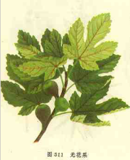 【标题】 无花果 【拼音】 Wú Huā Guǒ 【拉丁文】 Ficus carica L. 【异名】 阿驲、阿驿、映日果、优昙钵、蜜果、文仙果、奶浆果、品仙果、挣桃、树地瓜 【性味】 甘;性凉 【归经】 肺;胃;大肠经 【功效】 清热生津;健脾开胃;解毒消肿。主咽喉肿痛;燥咳声嘶;乳汁稀少;肠热便秘;食欲不振;消化不良,泄泻痢疾;痈肿;癣疾 【药用】 为桑科植物无花果的果实。 【用法用量】 内服:煎汤,9-15g;大脐量可用至30-60g;或生食鲜果1-2枚。外用:适量,煎水洗;研末调敷或吹喉。 【形态】 落叶灌木或小乔木,高达3-10m。全株具乳汁;多分枝,小枝粗壮,表面褐色,被稀短毛。叶互生;叶柄长2-5cm,粗壮;托叶卵状披针形,长约1cm,红色;叶片厚膜质,宽卵形或卵圆形,长10-24cm,宽8-22cm,3-5裂,裂片卵形,边缘有不规则钝齿,上面深绿色,粗糙,下面密生细小钟乳体及黄褐色短柔毛,基部浅心形,基生脉3-5条,侧脉5-7对。雌雄异株,隐头花序,花序托单生于叶腋;雄花和瘿花生于同一花序托内;雄花生于内壁口部,雄蕊2,花被片3一4;瘿花花柱侧生、短;雌花生在另一花序托内,花被片3-4,花柱侧生,柱头2裂。榕果(花序托)梨形,成熟时长3-5cm,呈紫红色或黄绿色,肉质,顶部下陷,基部有3苞片。花、果期 8-11月。 【生态环境】 现我国各地均有栽培。 【产地】 原产于亚洲西部及地中海地区。 【栽培】 生物学特性 喜温暖湿润气候,耐瘠,抗旱,不耐寒,不耐涝。以向阳、土层深厚、疏松肥沃。排水良好的砂质壤上或粘质壤土栽培为宜。 栽培技术 用扦插。分株。压条繁殖,尤以扦插繁殖为主。扦插繁殖:3月中、下旬从优良母株上选l~3年生未曾发芽的,而且节间短,枝粗在1~1.5cm的健壮枝条,剪成长30~50cm的插条,按行距50cm开沟,斜插入土三分之二,其余部分露出土外,填上压实,浇水保持土壤湿润。夏季扦插,可取半木质化的绿枝进行扦插。扦插后约1个月左右生根。培育1年即可移栽。亦可将插条用湿砂贮藏1个月,形成愈伤组织后再行扦插。分株繁殖:于2~3月进行分株栽种,定植按行株距(3~4)m×(3~4)m开穴栽种。栽种前要修剪,除去密枝或枯枝条,在树液未流动以前或展叶以前栽种为好。 田间管理 植株成活后进行松土、除草。在6月、7月各追施人粪尿或硫酸铵1次。栽种后要培养树冠形成无层形树形,或多主技自然开心树形,一般可在树干高50crn处定干,保留5~7个主枝,并可适当选用侧枝补空。树干定形后,每年要修剪,除去密枝、病虫枝及枯枝。疏势以轻剪为主。收秋果为主的,可在结果枝上短截留有2~3个芽,如果收夏果为主的则不宜短截。病虫害防治 病害有炭疽病,可用1:1:200信波尔多液喷射。虫害有桑天牛。 【显微特征】 粉末特征:淡黄棕色。①草酸钙簇晶多存在于花托薄壁细胞内,直径10-17μm。②花被碎片的边缘可见单细胞非腺毛,长33-10μm,基部较粗,光瑞急尖;果柄基部非腺毛,长达330-450(-600)μm,壁增厚。③果皮薄壁细胞内含有草酸钙结晶,呈方形、长方形、菱形,直径约5μm。④导管细小,主要为螺纹导管。⑤乳汁管有时可见。 【化学成分】 果实含有机酸类,其中有大量枸橼酸,并有少量延胡索酸(fumaric acid),琥珀酸(succinic acid),丙二酸(propane diacid),奎宁酸(quinic acid),莽草酸(shikimic acid)[1];还含 B族维生素[2]及无花果蛋白酶(ficin)[3],黄曲霉毒素(afla-toxin)B1、B2、G1、G2[4],γ-胡萝卜素(γ-carotene),叶黄素(lutein),堇黄质(violaxanthin)等类胡萝卜素类化合物[5];还含天冬氨酸(aspartic acid),甘氨酸(glycine),谷氨酸(glutamic acid),亮氨酸(leucine),蛋氨酸(methionine),丙氨酸(alanine)等氨基酸[6];并含寡肽如六肽( H-Ala-Val-Asp-Pro-Ile-Arg-OH),五肽(H-Leu-Tyr-Pro-Val-Lys-OH),三肽(H-Leu-Val-Arg-OH)[7],以及蛋白质脂肪、糖类及钙(Ca)、铁(Fe)等微量量元素[8]。 【理化鉴别】 取本品粉末5g,加水50ml,温水浴上加热15mm。取滤1ml,加碱性酒石酸铜试液4-5滴,在水浴上加温热5min,发生红棕色沉淀。 【药理作用】 1.无花果含丰富的营养成分,供食用。在便秘时,可用作食物性轻泻剂。树的乳胶汁中含有抑制大鼠移植性肉瘤之成分(注射时)。 2.干果的水提取物经活性炭、丙酮处理后所得之物质有抗艾氏肉瘤的作用。 3.从未成熟果实中所得的乳汁能抑制大鼠移植性肉瘤、小鼠自发性乳癌,致使肿瘤坏死;又能延缓移植性腺癌、骨髓性白血病、淋巴肉瘤之发展,使其退化。将此乳汁静脉注射0.02ml(大鼠)或0.05ml(兔),可使动物立即死亡,解剖可见内脏毛细血管损害;腹腔注射之情况相似;皮下注射可引起局部坏死;口服则无毒。其石油醚、乙醚提取物对免、猫、犬均有降压作用,呼吸略呈兴奋;在猫的瞬膜试验中,无神经节阻断作用。降压作用原理可能属于末梢性的。聚花果水浸液,或以石油醚提取后再以乙醚处理的提取物静脉注射,对麻醉兔和猫均有降压作用。 【采收加工】 7~10月果实呈绿色时,分批米摘;或拾取落地的未成熟果实,鲜果用开水烫后,晒十或供十。 【性状】 性状鉴 干燥的花序托呈倒圆锥形或类球形.长约2cm.直径1.5-2.Cm;表面淡黄棕色至暗棕色、青黑色有波状弯曲的纵棱线;顶端稍平截,中央有圆突形突起,基部渐狭,细小瘦果.有时壁的上部尚见枯萎的雄花。瘦果卵形或三棱状卵形.长1-2cm,淡黄色,外有宿萼包被。飞微,味甜、略酸。 以干燥、青黑色或暗棕色、无霉蛀者为佳。 【参考文献】 1.《滇南本草》:敷一切无名肿毒,痈疽疥癞癣疮,黄水疮,鱼口便毒,乳结,痘疮破烂;调芝麻油搽之。 2.《便民图纂》: