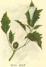 【标题】 曼陀罗子 【拼音】 Màn Tuó Luó Zǐ 【英文】 Datura Seed 【拉丁文】 Datura metel L. D. innoxia Mill. 【异名】 醉葡萄、天茄子、胡茄子、狗核桃、风茄果、竻仙桃、洋大麻子、山大麻子、伏茄子、醉仙桃 【性味】 味辛;苦;性温;有毒 【归经】 归肝;脾经 【功效】 平喘;祛风;止痛。主喘咳;惊痫;风寒湿痹;脱肛;跌打损伤;疮疖 【药用】 为茄科植物白曼陀罗和毛曼陀罗的果实或种子。 【应用】 1.治疗类风湿性关节炎:用曼陀罗子1份,搜山虎根(杜鹃花科羊踯躅的根)4份,焙干研粉,制成片剂,每片0.3g,每次1-2片,日服3次。15天为一疗程,问歇5-7天后续给第二疗程。在治疗过程中能减轻关节疼痛,使关节肿胀消退,关节活动亦有改善,对关节强直者无效。 2.用于散瞳采用不同浓度的曼陀罗子浸液与1%名后马托品进行对照观察。通过24例的散瞳试验,证明曼陀罗子浸液有散瞳及麻痹调节作用,但散瞳作用的出现,瞳孔对光反应消失与调节恢复之时间,均较后马托品缓慢)对眼压及房水流出易度C值之影响,两者无大差异。曼陀罗子浸液散瞳后的恢复时间,与阿托品比较约缩短一半。浸液的浓度以50-60%为合适。此外,曾以曼陀罗全草的煎剂及曼陀罗提取物的溶液,用于白内障针拨手术。 2.1.煎剂;曼陀罗全草1斤洗净,加净水1-1.5斤,煮沸约1小时,纱布3-4层过滤3-4次,将滤液浓缩至100ml,加入适量防腐剂,分装消毒滴眼瓶内备用。 2.2.30%曼陀罗溶液(用提纯的结晶粉未配制):在白内障针拨术前半小时,使用上述两种制剂中之一种滴眼,每5分钟1次,共4-5次。约20-30分钟瞳孔即开大固定,约至7-8mm大小即可切曰进针。此药只有麻痹缩瞳肌的作用,而无兴奋扩瞳肌的作用。在拨障手术过程中,若针触动虹膜过多,个别病人瞳孔会稍缩小,故应尽量避免触动虹膜。煎剂呈深酱油色,有细小颗粒,储存过久,易生大块絮状沉淀一口将此液再行煮沸过滤,其散瞳效果并不减低。 【注意】 《四川中药志》:无瘀积、体虚者忌用。 【用法用量】 内服:煎汤,0.15-0.3g;或浸酒。外用:适量,煎水洗;或浸酒涂擦。 【形态】 一年草本,高30-100cm。全株近无毛。茎直立,圆柱形,基部木质化,上部呈叉状分枝,绿色,表面有不规则皱纹,幼枝四棱形,略带紫色,被短柔毛。叶互生,上部叶近对生;叶柄长2-5cm;叶片宽卵形、长卵形或心脏形,长5-20cm,宽4-15cm,先端渐尖或锐尖,基部不对称,边缘具不规则短齿、或全缘而波状,两面无毛或被疏短毛,叶背面脉隆起。花单生于枝叉间或叶腋;花梗长约1cm,直立或斜伸,被白色短柔毛;花萼筒状,长4-6cm,直径1-1.5cm,淡黄绿色,先端5裂,裂片三角形,整齐或不整齐,先端尖,花后萼管自近基部处周裂而脱落,遗留的萼筒基部则宿存,果时增大呈盘状,直径2.5-3cm,边缘不反折;花冠管漏斗状,长14-20cm,檐部直径5-7cm,下部直径渐小,向上扩呈嗽叭,白色,具5棱,裂片5,裂片5,三角形,先端长尖;雄蕊5,生于花冠管内,花药线形,扁平,基部着生;雌蕊1,子房珠形,2室,疏生短刺毛,胚珠多数,花柱丝状,长11-16cm,柱头盾形。蒴果圆球形或扁球状,直径约3cm,外被疏短刺,熟时淡褐色,不规则4瓣裂。种子多数,扁平,略呈三角形,熟时褐色。花期3-11月,果期4-11月。 一年生草本,高1-2m。有恶臭,全株被白色细腺毛及短柔毛。茎粗壮,直立,圆柱形,基部木质化,上部多呈叉状分枝,灰绿色。叶互生或近对生;叶片广卵形,长8-20cm,宽5-12cm,先端急尖,基部斜心形,全缘或呈微波状,背面叶脉隆起。花大,直立或斜升,长15-20cm,直径7-8cm,花冠白色或淡紫色,具5棱;花萼筒部有5棱角,先端5浅裂,花后自近基部断裂,宿存部分椭果实而增大并向外反折。蒴果生于下垂的果梗上,近圆形,密生柔韧针状刺并密被短柔毛,熟时先端不规则裂开。种子多数,肾形,淡褐色或黄褐色。花期5-9月,果期6-10月。 【化学成分】 白曼陀罗 种子含莨菪碱(hyoscyamine),东莨菪碱(scopolamine)[1],环桉烯醇(cycloeucalenol),31-去甲羊毛甾-9(11)-烯醇[31-norlanost-9(11)-enol],31-去甲羊毛甾-8-烯醇(31-norlanost-8-enol),去四羊毛甾醇(norlanosterol),钝叶甾醇(obtusifoliol),4α-甲基胆甾-8-烯醇(4α-methylcholest-8-enol),4-甲基-7-胆甾烯醇(lophenol),α1-谷甾醇(citrostadienol)[2]。 种子油含油酸(oleic acid),亚油酸(linoleic acid)[3]。 2.毛曼陀罗 种子含α和β东莨菪宁碱(α-,β-scopo don-nine)[4],莨菪碱,东莨菪碱,陀罗碱(meteloidine),曼陀罗萜二醇(daturadiol),曼陀罗萜醇酮(daturaolone)[5],阿托品(atropine)[6]。植物凝集素(lectin)ⅠⅠ种子油含亚油酸和油酸[5]。 同属植物曼陀罗种子含阿托品,天仙子胺即东莨菪碱[8],莨菪碱[9],31-去甲环木菠萝烯醇(31-norcycloartenol),环桉烯醇(cycloeucalenol),4α-甲基胆甾-8-烯醇(4α-methylcholest-8-enol),31-去甲羊毛甾醇(31-norlanosterol),31-去甲羊毛甾醇-9(11)-烯醇[(31-norlanost-9(11)-enol],钝叶甾醇,4-甲基-7-烯胆甾烷醇,柠檬甾二烯醇(citrostadienol)[2],羊毛甾-8-烯-3β-醇(lanost-8-en-3β-ol),环木菠萝烯醇(cycloartenol),24--亚甲基环木菠萝烷醇(24-methylenecycloartenol),β-香树脂醇(β-amyrin),曼陀罗萜醇酮(daturaolone),曼陀罗萜二醇(daturadiol)[10],及脂肪酸[11]等。 【药理作用】 散瞳作用:螺陀罗子浸液有散瞳麻痹作用。 【采收加工】 夏、秋季果产成熟时采收,亦可晒干后到出种子。 【炮制】 阴干、备用。 【附方】 ①治脱肛:曼陀罗花子(连壳)一对,橡碗十六个。上捣碎,水煎三、五沸;入朴硝热洗。(《儒门事亲》)②治跌打损伤:曼陀罗子一钱,泡酒六两。每次服三钱。(《民间常用草药汇编》)③治