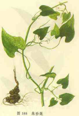【标题】 朱砂莲 【拼音】 Zhū Shā Lián 【英文】 Root of Kaempfer Dutchmanspipe 【拉丁文】 Aristolochia cinnabarina C.Y.Cheng et J.L.Wu[A.minutissima C.Y.Cheng] 【异名】 辟虺雷、辟蛇雷、透水雷、辟水雷、雷见怕、牛血莲、躲蛇生、避蛇生。 【性味】 苦;辛;寒 【归经】 心;肺;肝经 【功效】 清热解毒;理气止痛。主痈疡肿毒;暑邪痧气;腹泻痢疾;胸腹疼痛;牙痛;喉痛;叶血;蛇伤 【药用】 为马兜铃科植物四川朱砂莲的块根。 【注意】 《广西中药志》:虚弱者忌用。 【用法用量】 内服:煎汤,5-10g,鲜品量可酌加;或研末,每次0.5-1g,每日2次。外用:适量,磨粉,酒或醋调涂。 【形态】 四川朱砂莲 多年生草质藤本,全株无毛。根块状,呈不规则纺锤形,长达15cm或更长,直径达8cm,常2-3个相连,表反有不规则皱纹,内面浅黄色或橙黄色。茎细长扭曲,具纵棱和粉霜。叶柄长4-15cm;叶片三角状心形,生于茎下部的叶常较大,长5-14cm,宽4-11cm,先端钝,具小尖头,基部心形;全缘,上面绿色,具白色晕斑,下面脉隆起。花2-3朵组成短总状花序,偶单花胶生;小花梗细长,基部具叶状苞片l枚;花被黄绿色或暗紫色,基部球形,颈部窄缩并弯转,前部扩大并向一侧展开是舌状,舌状体长卵形,先端圆钝或具小凸尖,有5条脉;管口具紫色斑块并疏生绒毛;雄蕊贴生于雌蕊周围,花药卵形;合蕊往先端6裂,裂片基部向下延伸成波状圆环,柱头乳突状,子房倒卵形,微具6棱。蒴果长椭圆球形,基部下延,连柄长6-7cm,黄绿色,具粉霜,熟后自果柄处6裂。种子三角状心形,扁平,一面隆起,另一面凹下,外表褐色,密被疣状突起。花期11月至翌年4月,果期 6-10月。 【生态环境】 生于海拔150-1600m的石灰岩山上或山沟两旁灌丛中。 【产地】 分布于湖北、广西、四川、贵州、云南。 【栽培】 生物学特性 耐阴,以荫蔽的环境为宜。若光照过强,气温高,则幼苗极易死亡。产区栽培多选择红紫泥土。 栽培技术 用种子繁殖,育苗移栽法。选择地势倾斜、阴湿的砂壤土作苗床。深翻细耙作高畦,畦宽70cm,长度不定。6月中旬果实成熟后及时采收,晾干,开裂后除去果壳,于7月上旬播种。撒播,覆细土约1.5cm,搭棚遮荫。苗龄约60d真叶5-6片时移栽,行株距 20cm X 7cm。 田间管理 移栽后及时搭荫棚,棚高1.6-2m,荫蔽度30%左右。缺苗者需及时补栽,勤除草。移栽后施1次定根肥,转青后追肥1次。以后每年返青后追肥1次。返苗后进行1次浅耕。生长期注意培土,防止块根外露。 病虫害防治 (1)白绢病为害块根,高温、高湿季节发病最盛。防治方法:及时拔除病株并销毁,病穴用石灰消毒。雨季防止积水。与禾本科作物轮作。(2)马兜铃凤蝶幼虫7月下旬至10月下旬咬食叶片和茎,可喷90%敌百虫500-800倍液防治。10月上旬开始化蛹,可人工捕。 (3)金裳凤蝶幼虫零星为害,防治方法同马兜铃凤蝶。(4)裂爪螨整个生育期均有发生,以4-5月至返苗前为害最重。喷20 %双甲眯1000倍液或73%克螨特3000倍液防治。此外还有蚜虫为害。 【显微特征】 块根根切面:木栓层由3-5列细胞组成。皮层外侧有2-6列石细胞排成环带。中柱维管束外韧型,被射线分成12-13束,中央为薄壁细胞。皮层及中往薄壁组织散有分泌细胞,内含橙红色物质。 【化学成分】 种子含马兜铃酸(Aristolochicacid)、木兰花碱(Magnoflorine)、轮换藤酚碱(Cyclanoline,Clssamine)和巴婆碱(Asimilobine)。 【理化鉴别】 薄层色谱:取本品粉末2g,加乙醇25ml,置水浴加热lh,滤过。滤浓浓缩至5ml,作供试品用。另取马兜铃酸制成每lml中含1mg的对照液。取上述两种溶液各3μl点于同一硅胶G薄层板上,以苯-甲醇-醋酸(5:8:o.2)为展开剂,展开,取出,晾干。量紫外光灯(365nm)下检视,供试品色谱中在与对照品相应位置上,显相同颜色荧光斑点。 【采收加工】 移栽4年以上时采收为宜。6-7月挖起块根,除去残茎及须根,洗净泥沙,蒸至透心(一般需10-25min),再晒干或烘干。 【图片】 朱砂莲 ![]() (责任编辑:Doctor001) |