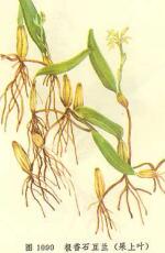 【标题】 果上叶 【拼音】 Guǒ Shànɡ Yè 【英文】 Herb of Denseflower Bulbophyllum 【拉丁文】 Bulbophyllum odoratissimum (J.E.Smith)Lindl.[Stelis odoratissimum J.E.Smith] 【异名】 小果上叶、石串莲、极香石豆兰、羊奶果 【性味】 甘;淡;凉 【归经】 肺;肝;肾经 【功效】 润肺化痰;通络止痛。主肺结核咯血;慢性气管炎;慢性咽炎;疝气疼痛;月经不调;风湿痹痛;跌打损伤 【药用】 为兰科植物密花石豆兰的全草。 【用法用量】 内服:煎汤,6-12g。外用:适量,捣敷。 【形态】 密花石豆兰,附生植物。根茎纤细,粗约2mm。假鳞茎近圆柱形,长2.5-4cm,粗3-6(-9)mm,彼此相距4-7cm,基部生多数须根。顶生1叶近无柄;叶片革质,厚而脆,狭长圆形,长4-11cm,宽8-18mm,先端微凹,基部楔形,全缘;中脉明显。花葶1-2,生于假鳞茎基部,直立,通常高出叶,被有3-4枚鞘。总状花序顶生,密集10朵花以上呈伞状球形;花小,黄色,极芳香;花苞片卵状披针形,比花梗(连子房)长;萼片披针形,向先端渐尖,中上部边缘上卷呈圆筒状,中萼片长6-8mm,侧萼片比中萼片长;花瓣卵圆形,长约1.2mm,先端钝,唇瓣肉质,近舌状,比花瓣长,中央略凹陷,边缘具细齿;合蕊柱齿牙齿状,蕊柱脚短,其离生部分不明显。蒴果卵形,长约1cm。 【生态环境】 附生于山林树上或山沟岩石上。 【产地】 分布于福建、广东、广西、四川、云南、西藏等地。 【化学成分】 含石豆兰菲醌(bulbophyllanthrone),白杨素(chrysin),短叶松黄烷酮(pinobanksin)。 【采收加工】 全年均可采,洗净,鲜用或蒸后晒干。 【参考文献】 1.《昆明民间常用草药》:祛风湿,活络,行气,止痛。 2.《云南中草药选》:接骨消炎,润肺化痰。治骨折,肺结核,咯血,慢性气管炎,肺炎恢复期,慢性咽炎,月经不调。 3.《贵州药植目录》:清热润燥,生津止渴。 【图片】 极香石豆兰 ![]() 果上叶 (责任编辑:Doctor001) |